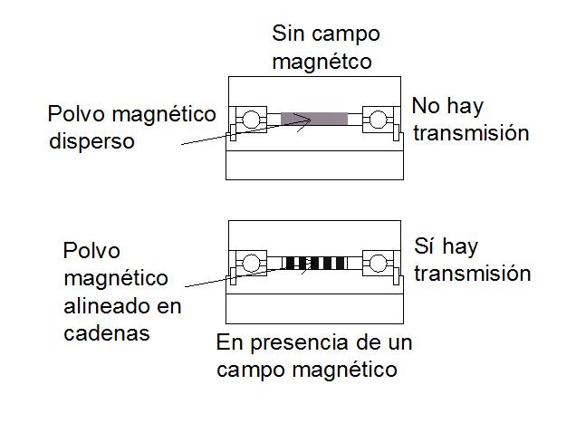 Los frenos y embragues a base de partículas magnéticas tienen separado el elemento motriz del conducido y en el hueco que se forma por esta separación se coloca polvo con partículas que forman cadenas ante la presencia de un campo magnético. Estas cadenas unen los dos lados permitiendo la transmisión de un par. La transmisión, entonces, no se da en base a la atracción o repulsión entre campos magnéticos, sino en base a la fuerza que une a estas cadenas entre sí y con las superficies tanto del lado motriz y como del lado conducido.